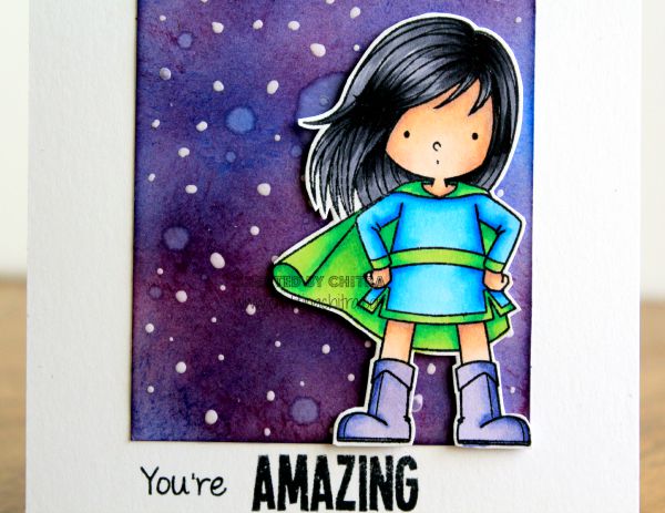 I played with my new Clearly Besotted stamps called "You Rock". These cuties are stamped using MFT black hybrid ink onto Tim Holtz watercolor cardstock. I colored the whole scene using my new watercolors.